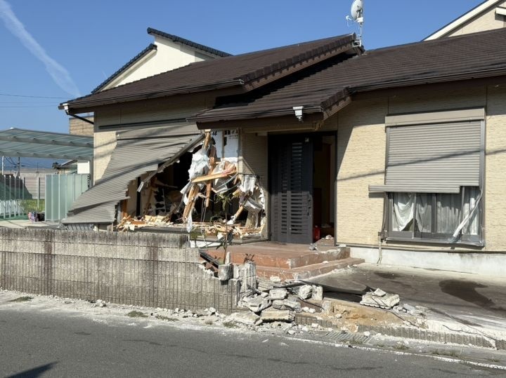 市道を走っていた車が塀を破り、民家に突っ込んだという。