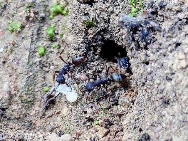 サムライアリは本州、四国、九州に分布する体長7ミリ前後のアリで、鎌状のあごが特徴。三田さんは6月下旬の午後5時ごろ、同市北方町の雑木林でサムライアリが大群で巣を襲う様子を確認。ハヤシクロヤマアリの巣からさなぎを持ち去る奴隷狩りの様子を写真に収めた。