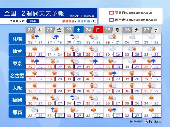 厳しすぎる残暑は8月末にかけても続くでしょう。特に24日(日)にかけては東北南部から九州で35℃以上の猛暑日が続出し、関東や東海を中心に40℃を超えるような災害レベルの暑さとなる所もありそうです。また、北日本や東日本、西日本では6月下旬から少雨が続いており、この先2週間程度も雨の少ない状態が続くでしょう。