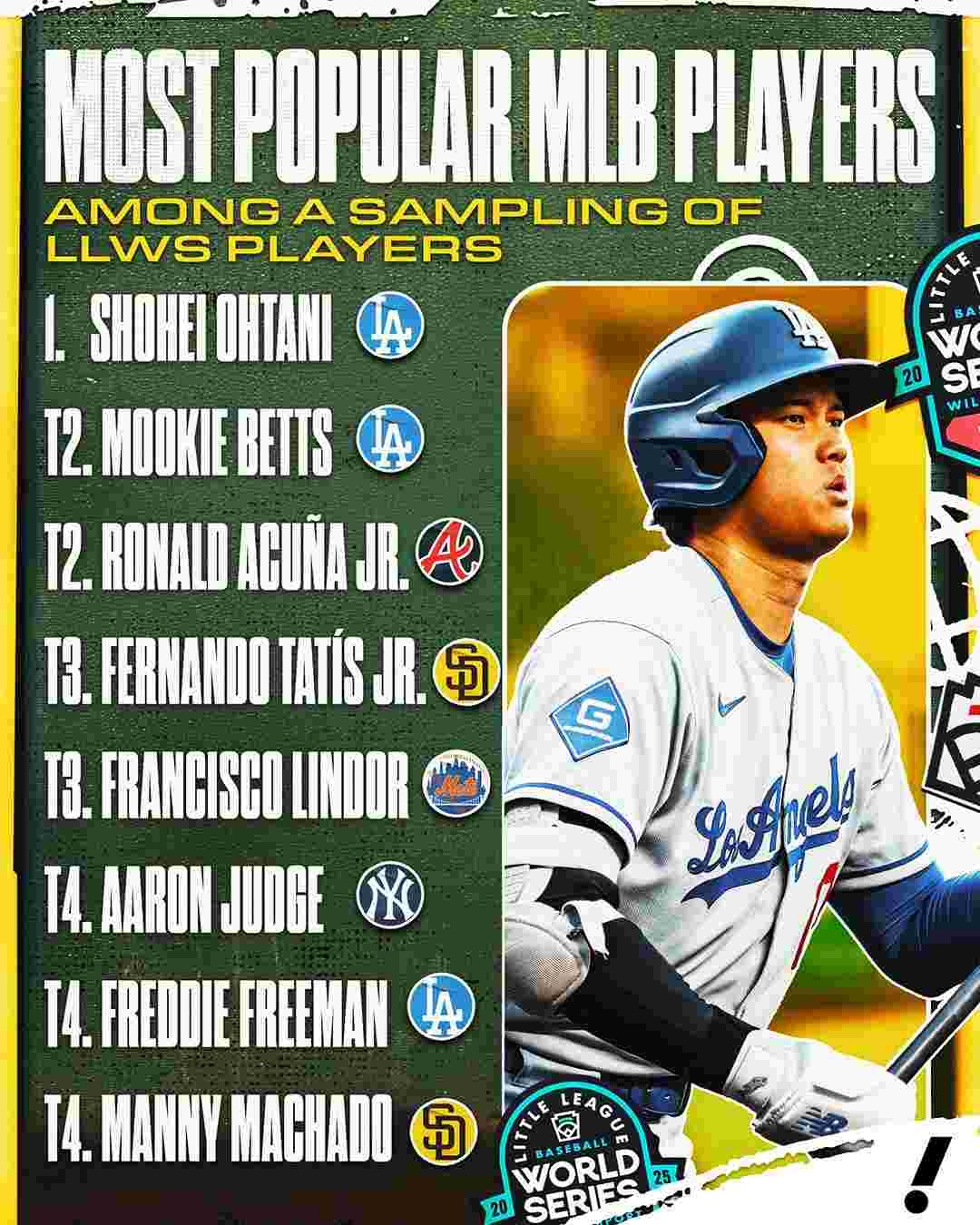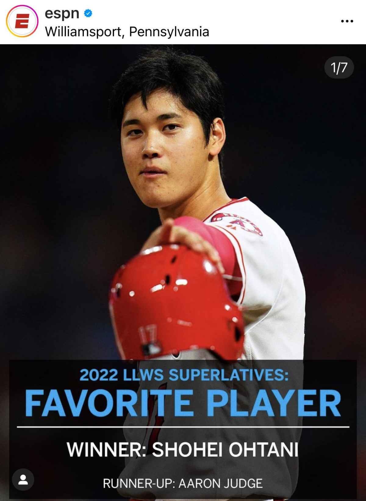 米大リーグのエンゼルス・大谷翔平投手は世界一を目指すリトルリーガーたちのNo.1の憧れのようだ。米スポーツ専門局「ESPN」は現在開催中のリトルリーグ・ワールドシリーズに出場中の人気投票の結果を公式インスタグラムで公表。「最も好きな野球選手」部門で大谷が選ばれている。