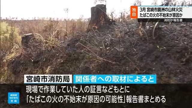 宮崎 鏡洲の山林火災 たばこの火の不始末が原因の可能性