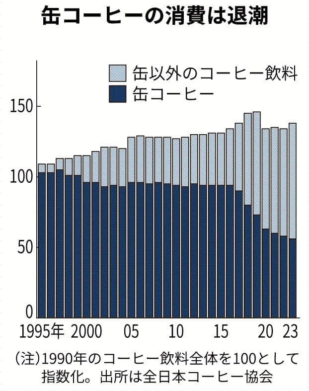 缶コーヒーの国内需要が低迷している。コーヒー自体の値上がりが敬遠されたのに加え、近年はペットボトルやコンビニコーヒーなど飲み方が多様化し、缶コーヒーの消費量は2013年からの10年間で4割減った。長