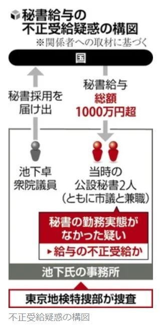 だが、関係者によると、元市議2人に秘書としての勤務実態がなく、秘書給与を不正に受給していた疑いが浮上。国に秘書の採用を届け出ていた池下氏も勤務実態がないことを把握していた可能性がある。特捜部は、池下氏の事務所の実情を知る関係者に事情を聞くなどして2人の勤務実態や給与の支払い状況などを調べているとみられる。