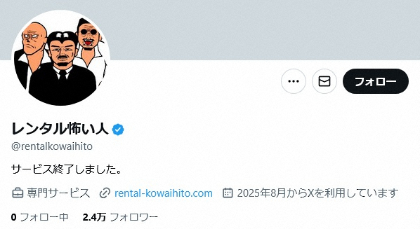 https://news.livedoor.com/article/detail/29478287/公式Xにて「諸事情により当サービスは終了しました」と報告。公式サイトではサービス内容について「威圧感のある見た目の『怖い人』を貸し出します」としていた。
