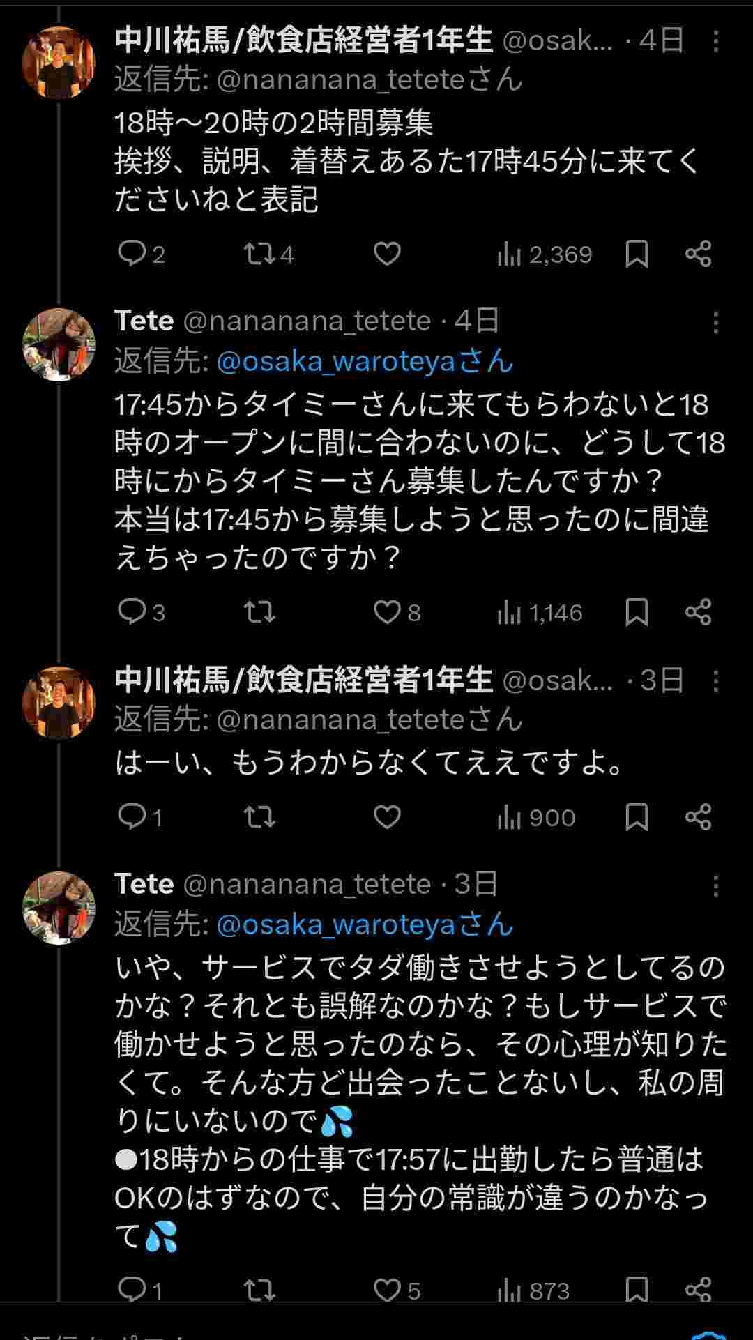 着替えや業務内容説明も業務時間に入るからそれをわかってなかったのが店主。わかってるのがteteって奴