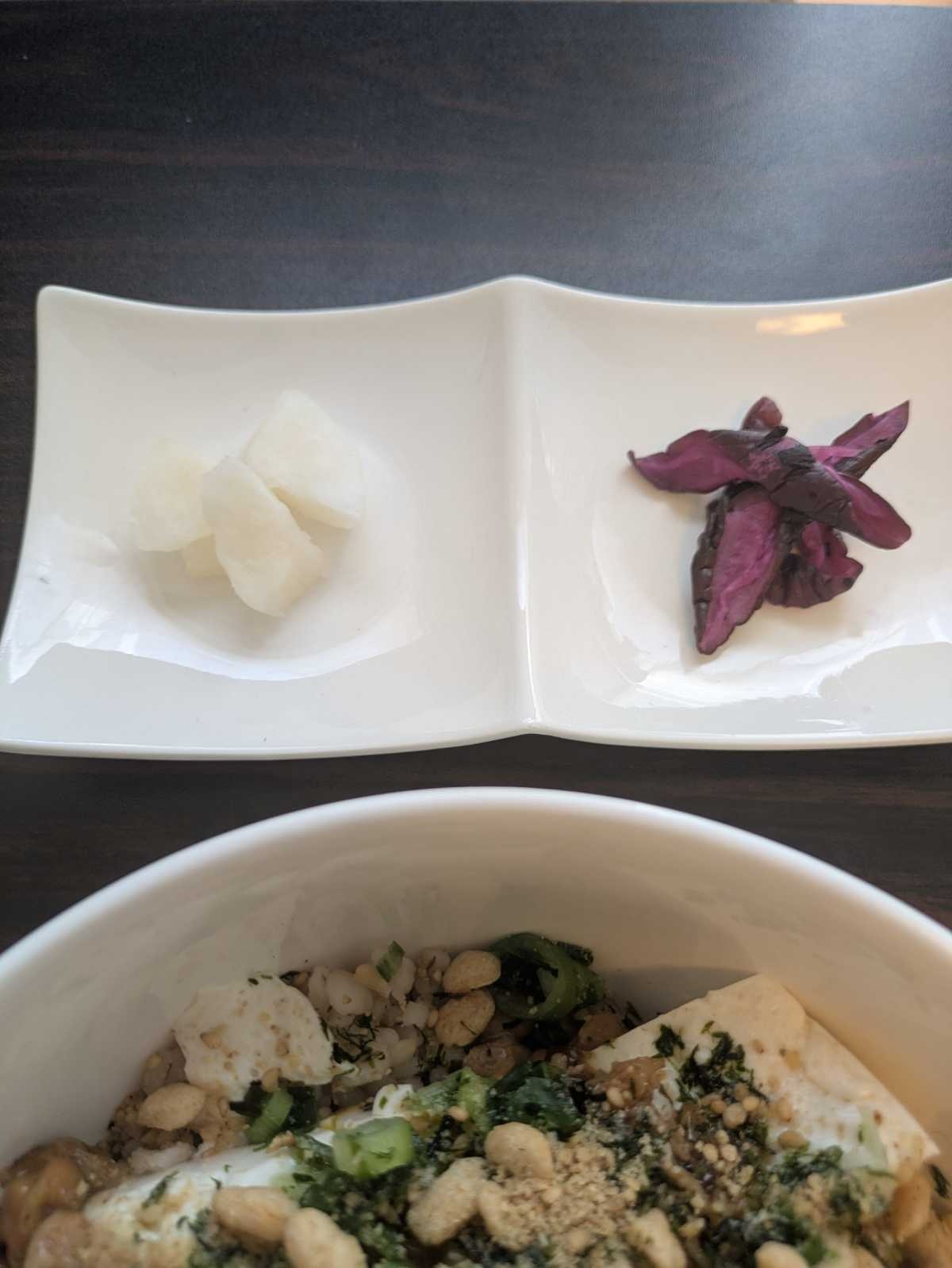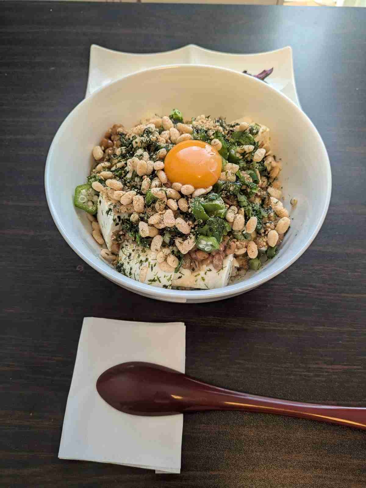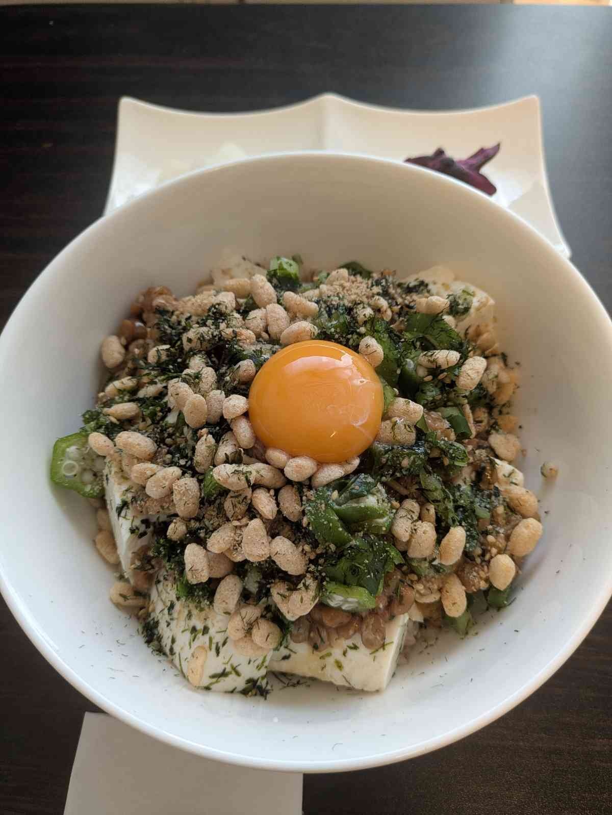 下から雑穀米+もち麦+胚芽押麦のミックス、絹豆腐、極小粒納豆、なめ茸、オクラ、刻みネギ、天かす、青のり、すりごま、卵黄