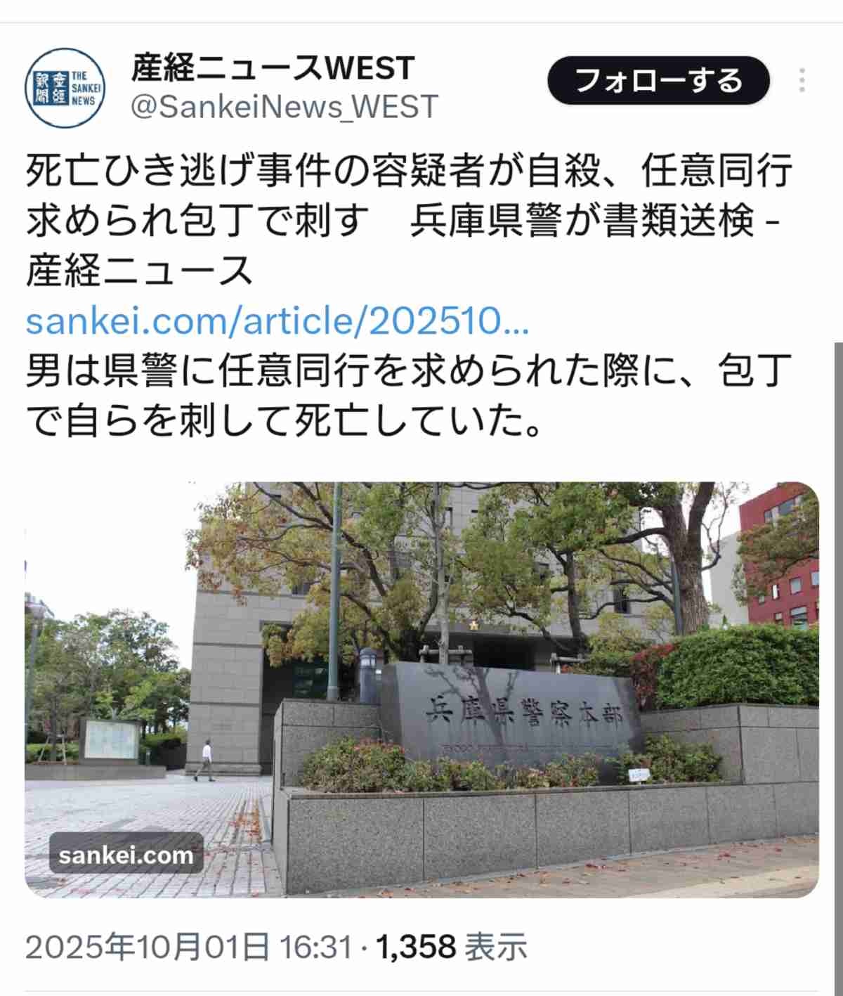 死亡ひき逃げ事件の容疑者が自殺、任意同行求められ包丁で刺す 兵庫県警が書類送検