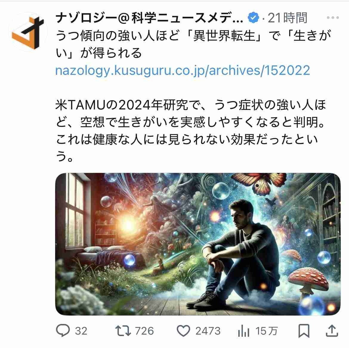これに対し、うつ症状の強い人は現実世界に意味を見出すことが難しいため、現実に束縛されない空想の世界に人生の意味を見出しやすくなっているというのです。