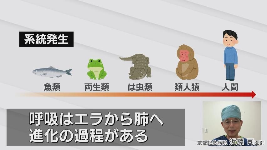 「系統発生といって、お魚からカエルになってトカゲになるみたいな(流れ)。水の中から陸上に上がって、呼吸はエラから肺へ進化の過程があるんです」
