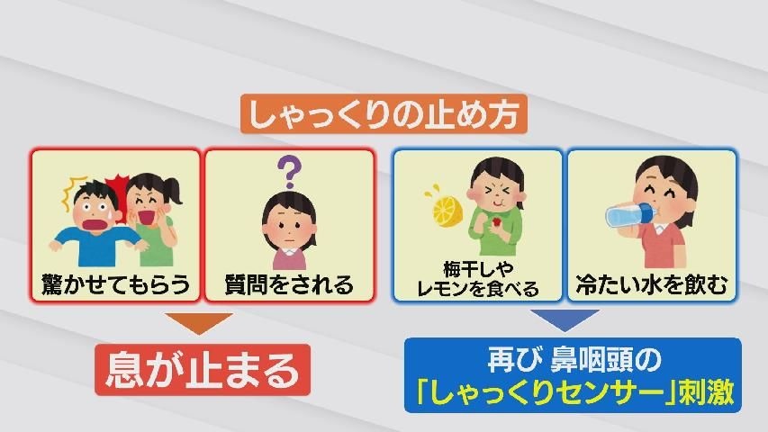②梅干しやレモンを食べたり、冷たい水を飲んだりして再び「しゃっくりセンサーを刺激」すること