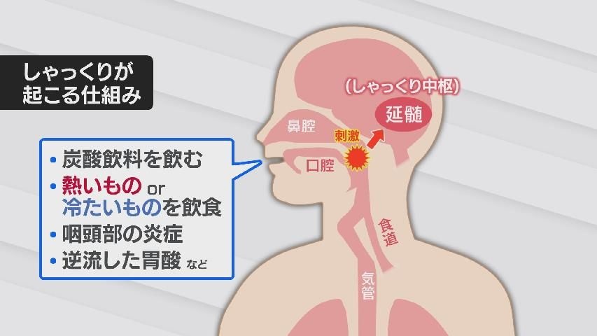 人は、熱いものや冷たいものを飲み食いした時や、胃酸が逆流した時、炭酸飲料を飲んだ時などに鼻と喉の間にある「しゃっくりセンサー」が刺激されます。
