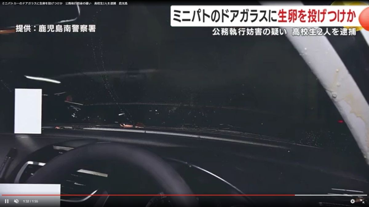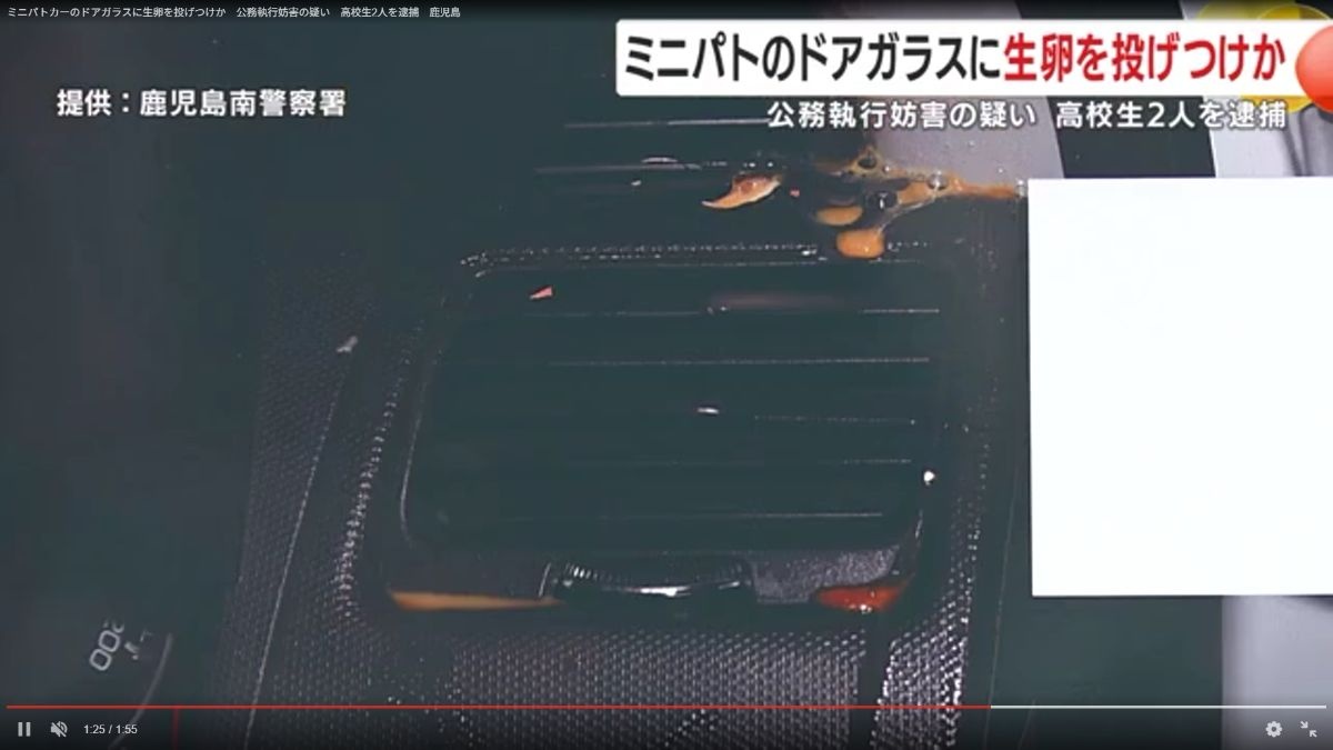 「こちらが生卵を投げつけられたパトカーです。運転席側のドアガラス付近に当たったということです」公務執行妨害の疑いで逮捕されたのは、鹿児島市の17歳と18歳の男子高校生です。