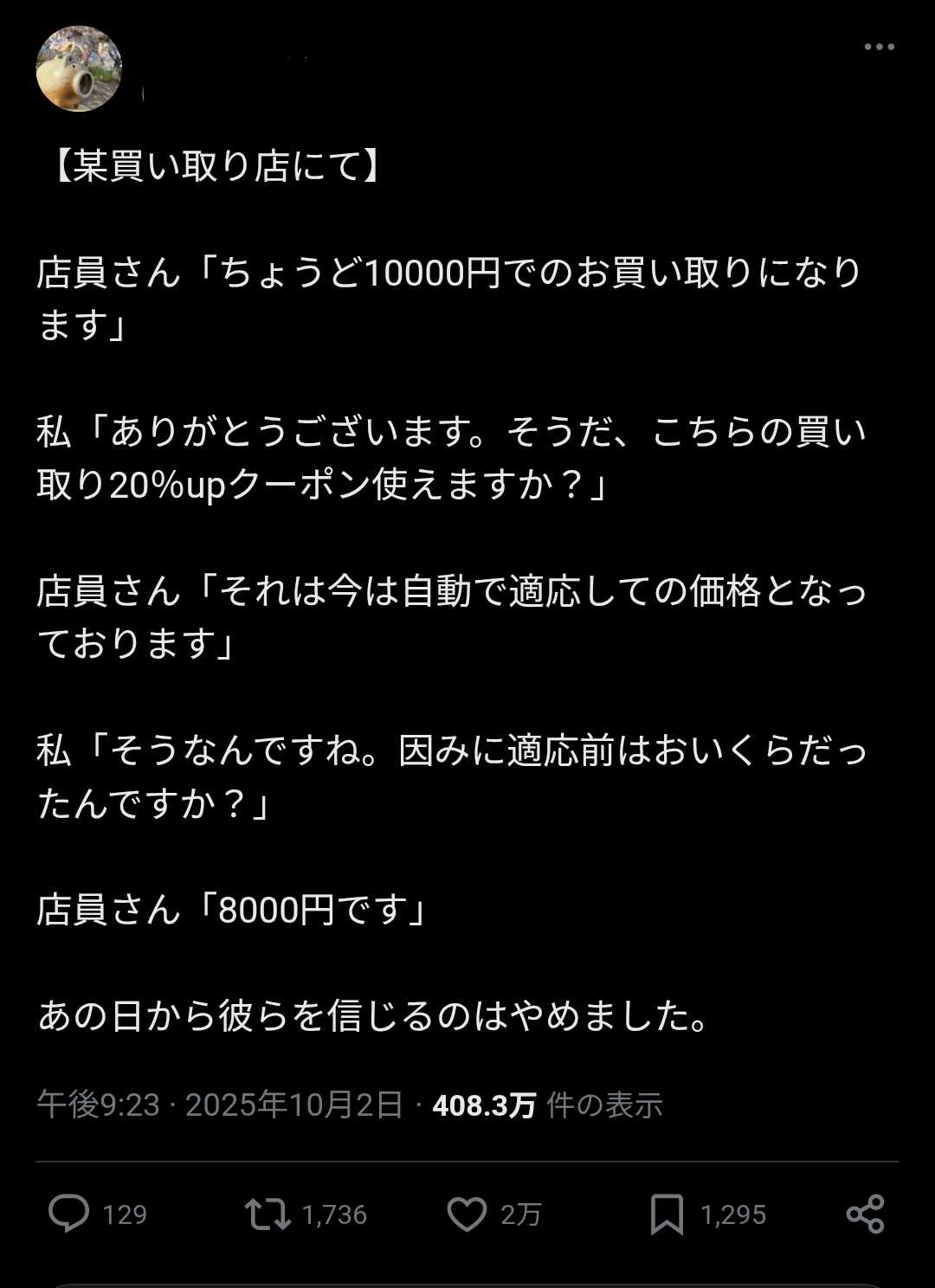 買取20%アップキャンペーンで炎上⋯店員「本当は8000円のところ1万円です」⇐400万ビュー