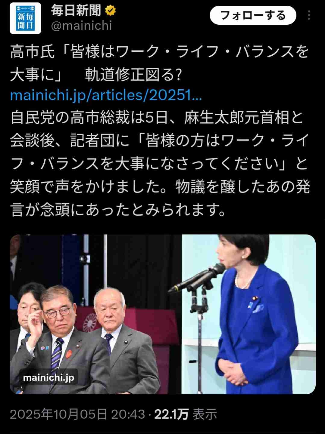 総理になった高市早苗さんがワークライフバランス必要無い言ってるだぞ言うてサラリーマン批判してた経営者達どうするんやろか