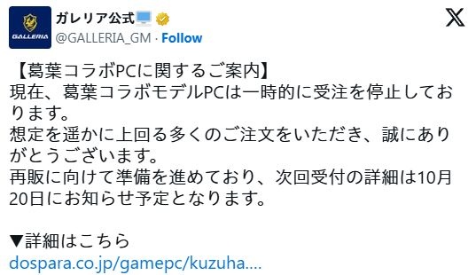ドスパラの発表では「想定を遥かに上回る」多くの注文があったことから、予約受付を停止したとしている。次回予約受付については10月20日に告知する予定。