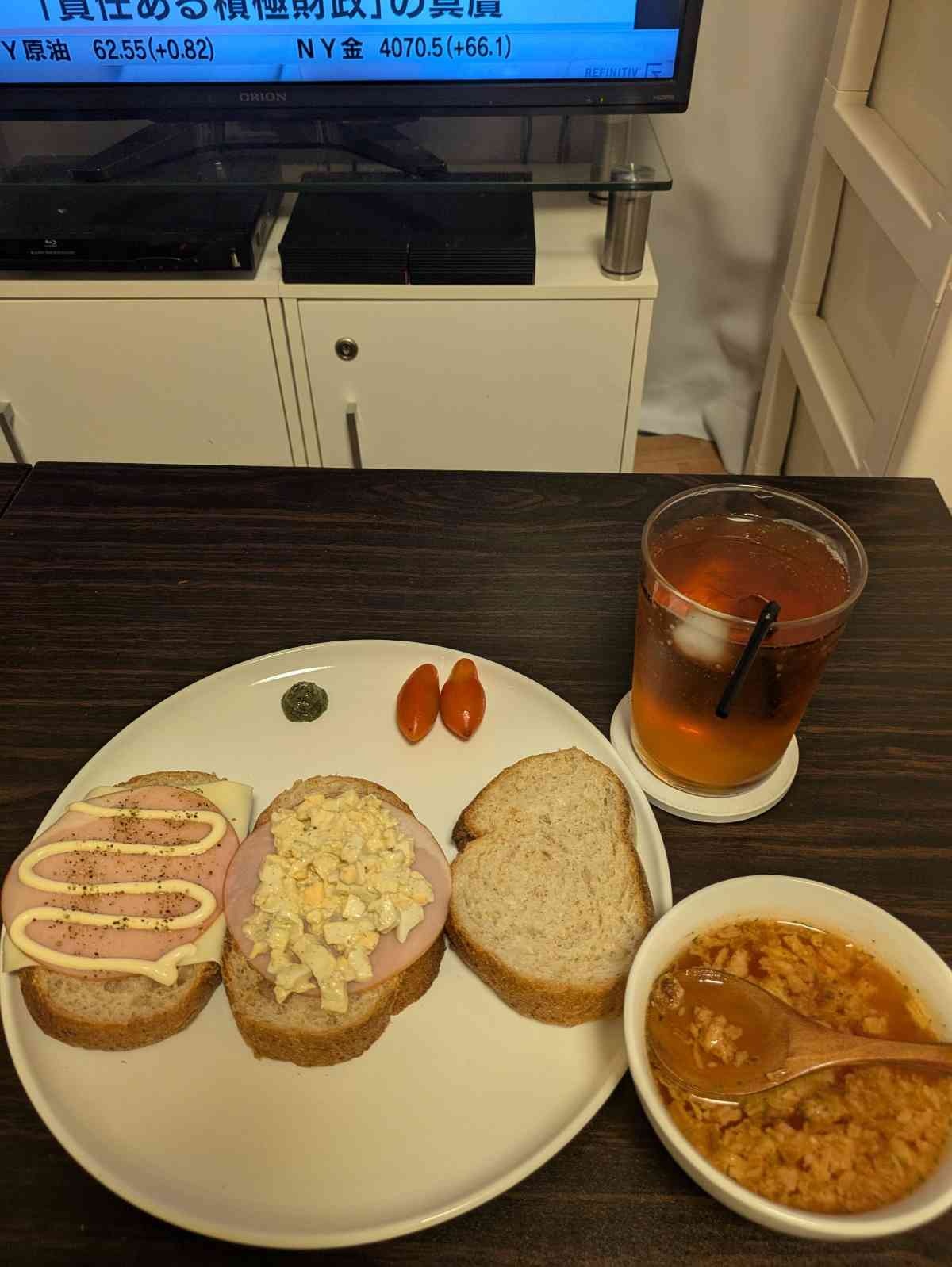 ほんとは右のパンにジャム塗ろうと思ってたけどジャム全部カビ生えてて断念した😭