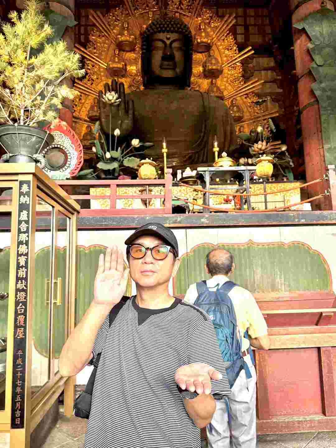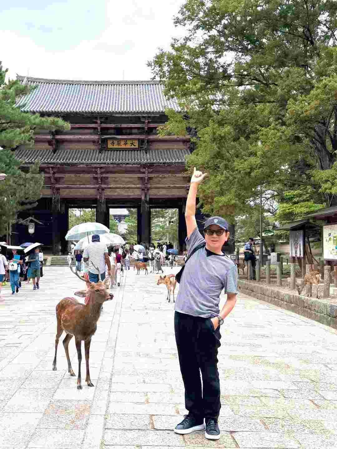 鹿もガン見…。東大寺前でポーズを決めた藤井フミヤ