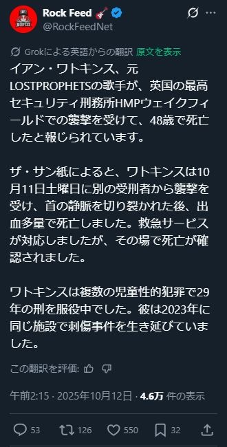 元有名ロック歌手、児童性的虐待で禁錮29年 英裁判所英国南西部カーディフの裁判所は18日、乳児のレイプ未遂も含め、複数の児童に性的虐待行為を働いたとして同国のロックバンド「ロストプロフェッツ」の元ボーカル、イアン・ワトキンス被告(36)に禁錮35年の判決を下した。www.cnn.co.jp