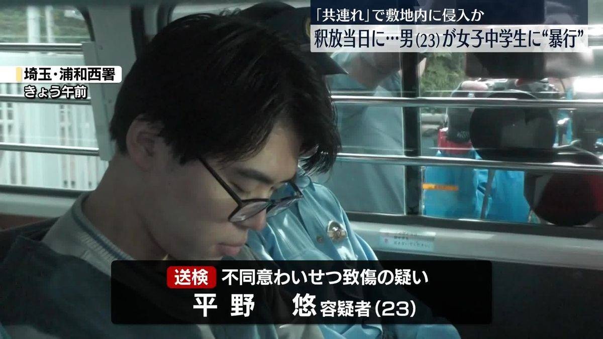 さいたま市内で女子中学生に暴行を加えたとして、埼玉県警は住居不定の無職平野悠容疑者(23)を暴行容疑で21日逮捕し、22日発表した。県警などによると、平野容疑者は別の事件で性的姿態撮影等処罰法違反などの罪で執行猶予付きの有罪判決を受け、釈放された当日に暴行した疑いがあるという。