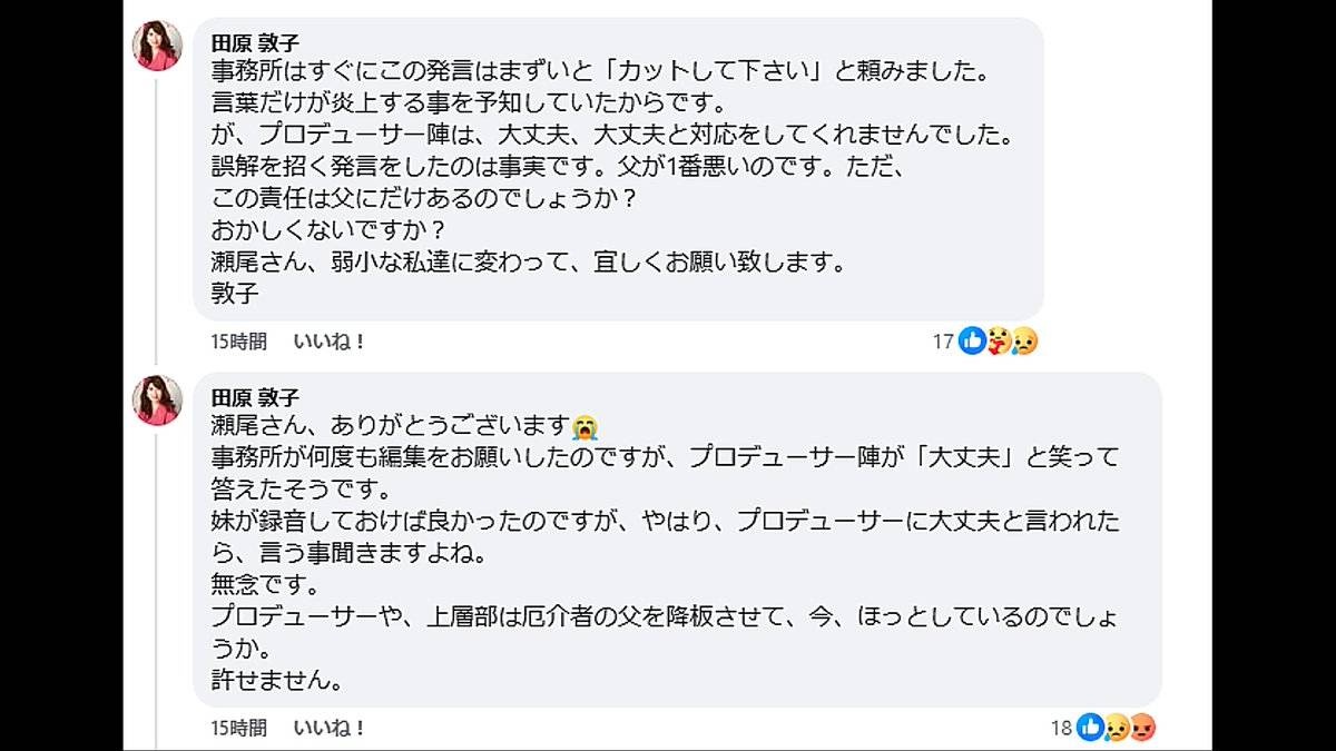 ただ娘含め田原側もテレ朝に依存しすぎてた面は否めない、元テレ朝社員も事務所に受け入れてたはず