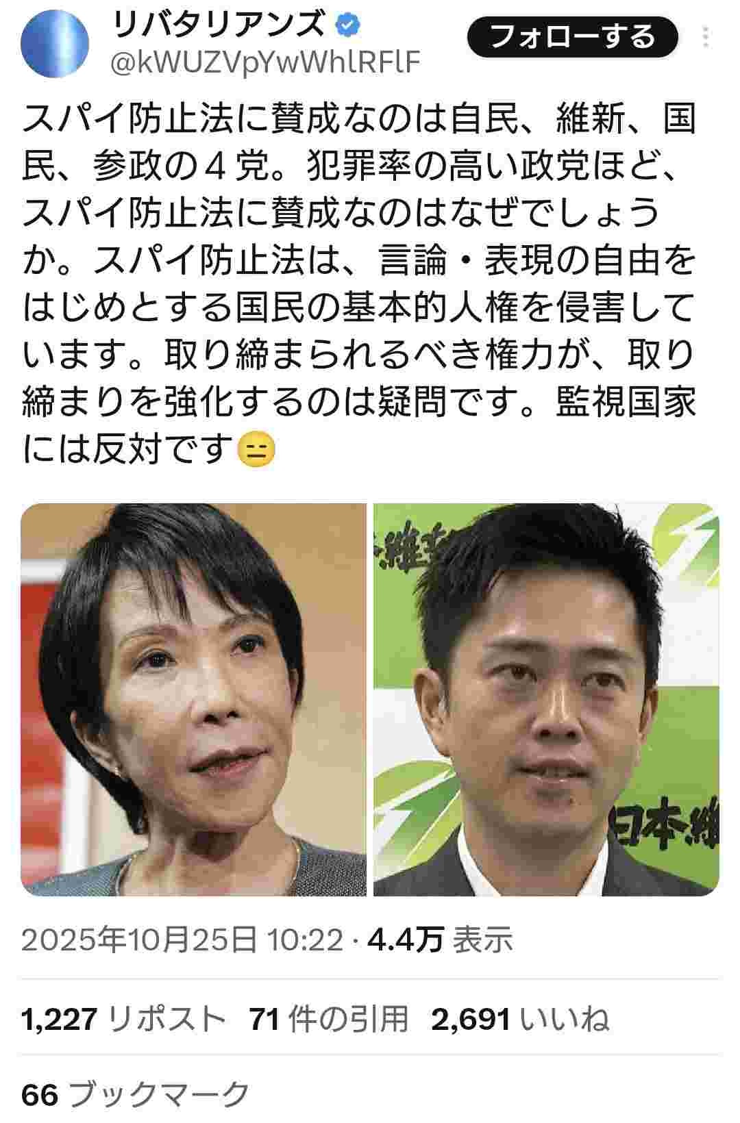 サドルから産まれた鮭(身が赤い)党はスパイ防止法に賛成だったんだ
