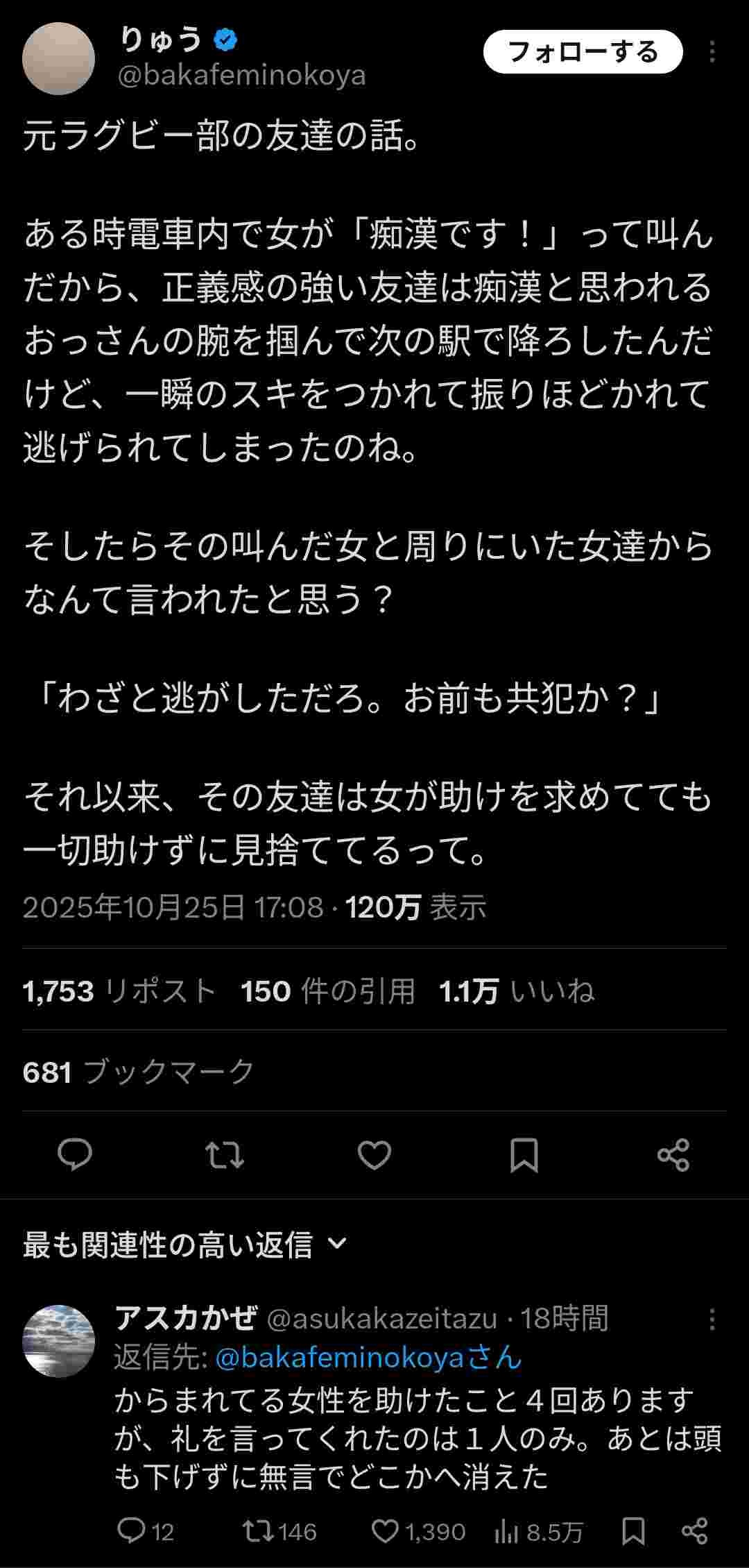 女が痴漢ですとか騒いでも無視すればええやん自分が被害にあったわけでもないのに