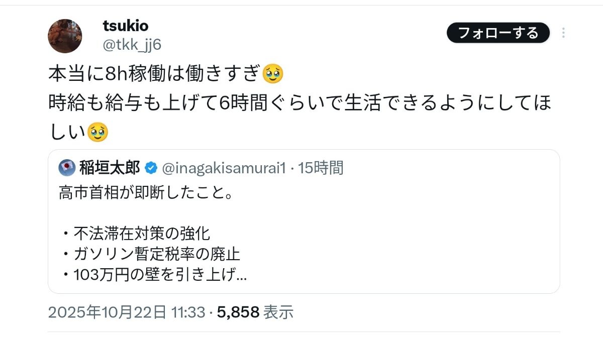 高市が「労働時間を短くして給料を上げる」という方向に行くはずがないんだわ