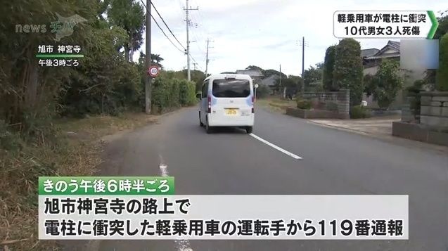 26日午後6時半ごろ、旭市神宮寺で10代の男女3人が乗っていた軽乗用車が電柱に衝突しました。