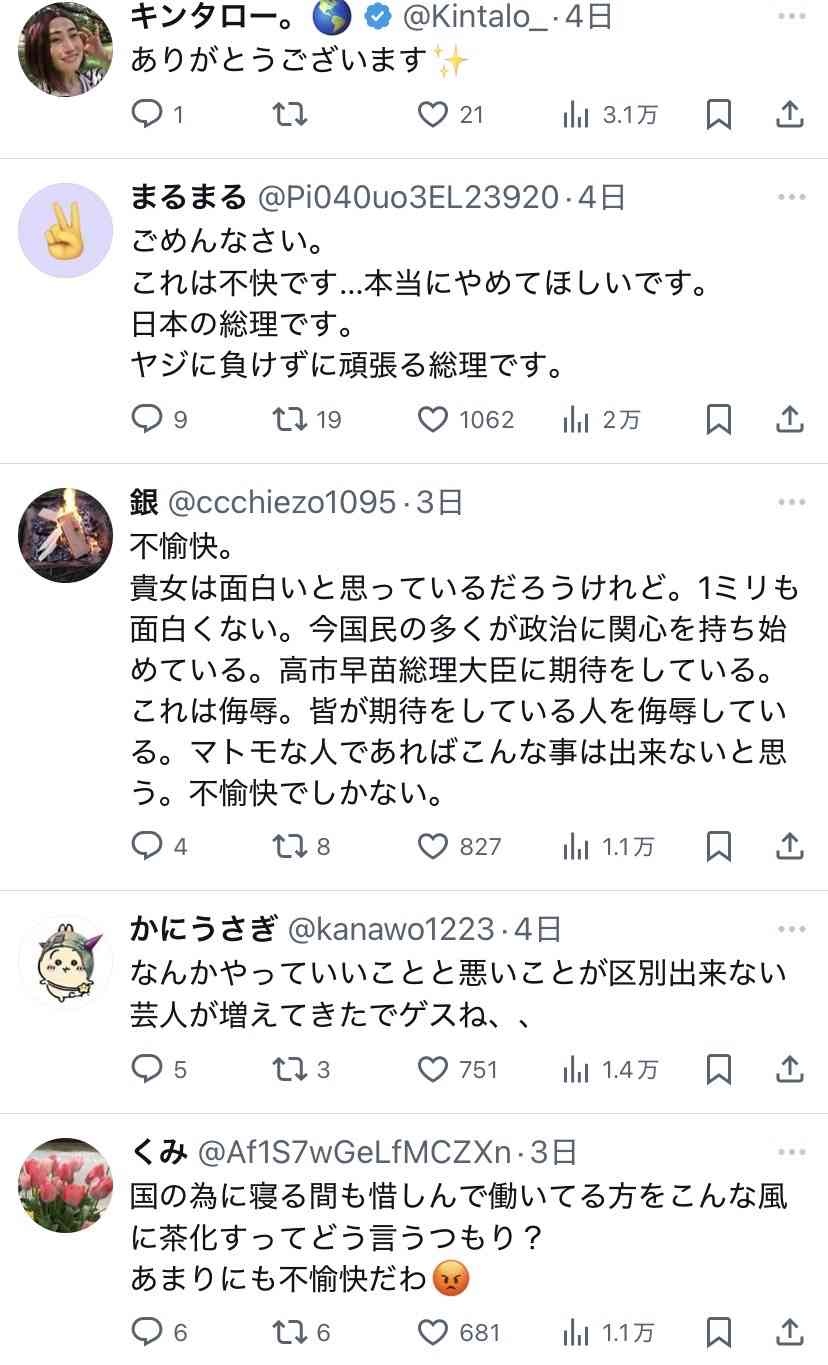 「高市さんはそんなんじゃない!」ならまだわかるけど「日本の首相をそんな風に扱うな!」って奴結構いるんだな