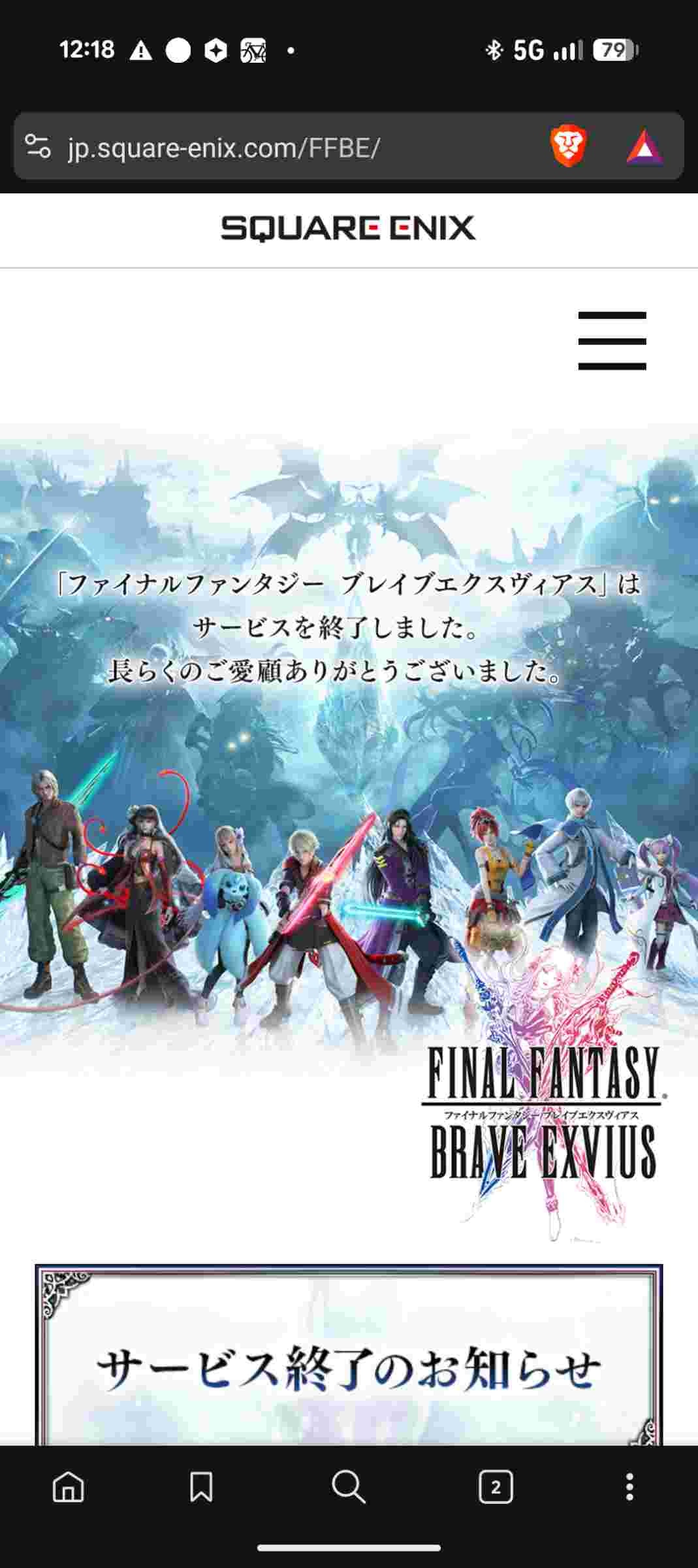 この度、『FINAL FANTASY BRAVE EXVIUS』は、誠に勝手ながら2025年10月31日(金)12:00をもちまして、サービスを終了させていただくこととなりました。
