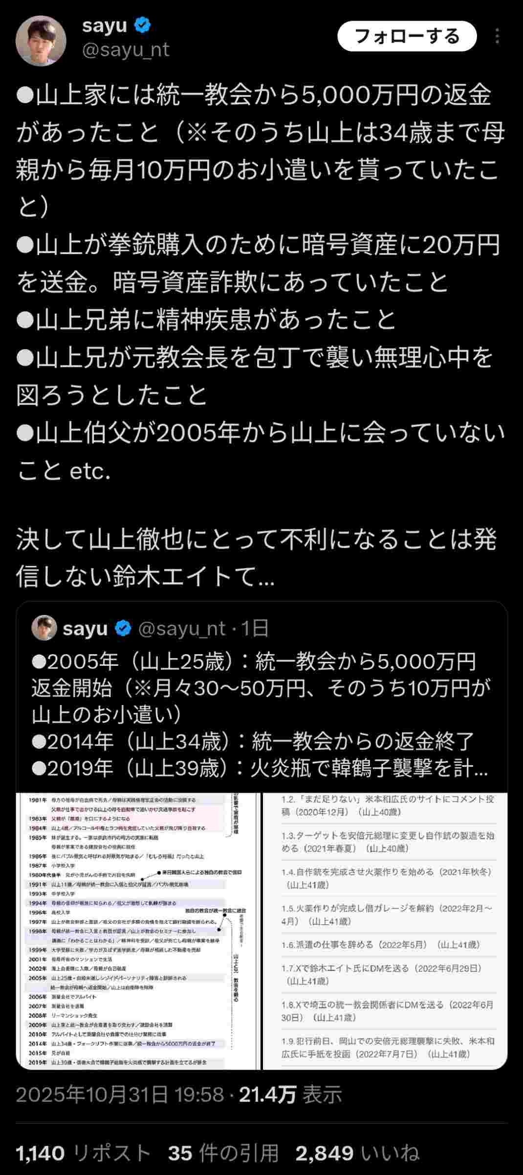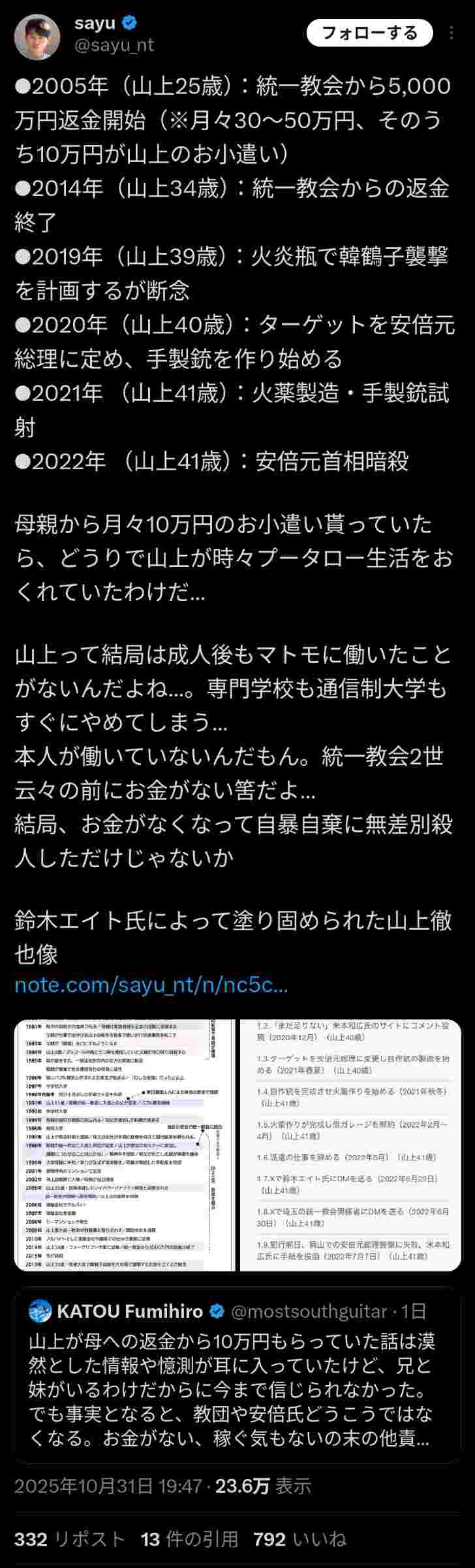 これ普通に統一教会からのお小遣いがなくなった弱男が逆恨みしただけよね
