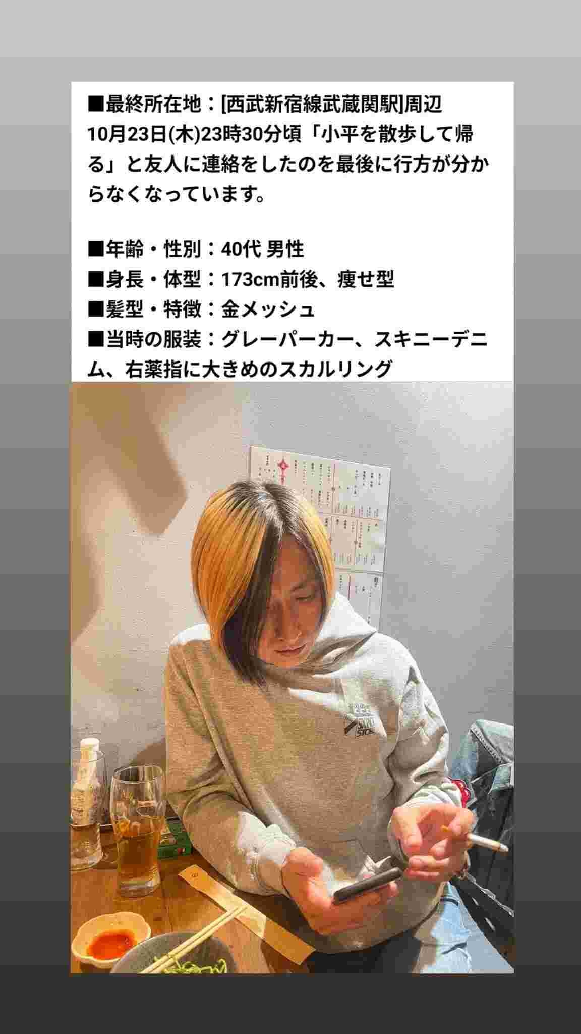 武蔵関駅周辺で小平に散歩って言って行方不明のベーシストさん、金髪メッシュにスカルリングって目立つし何か情報あるといいんだけど