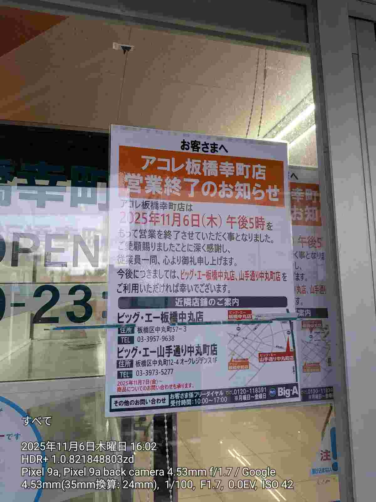 今後につきましては、ビッグ・エー板橋中丸店またはビッグ・エー山手通り中丸町店をご利用いただければ幸いでございます。