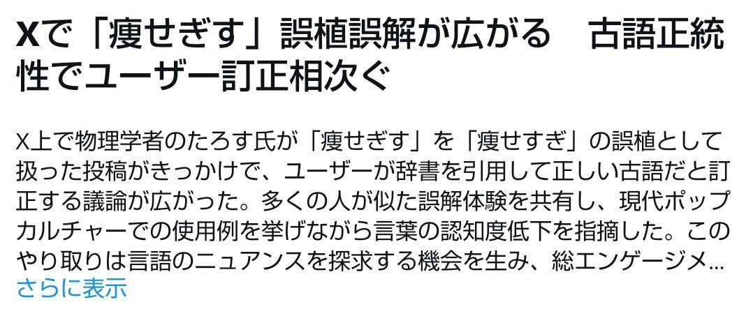 114件のポストAISNS上で、「痩せぎす」という言葉が誤植と認識されているケースが話題になっている。一部のユーザーは「痩せぎす」を知らない一方で、その言葉を知っているユーザーは誤解を解く投稿をしている。
