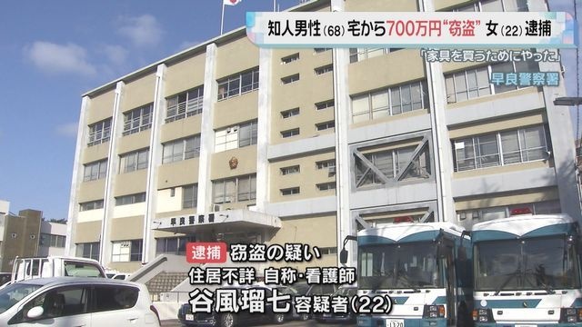 福岡市の68歳の男性の自宅から現金およそ700万円を盗んだとして自称・看護師の22歳の女が逮捕されました。女は「家具を買うためにやった」と供述しています。