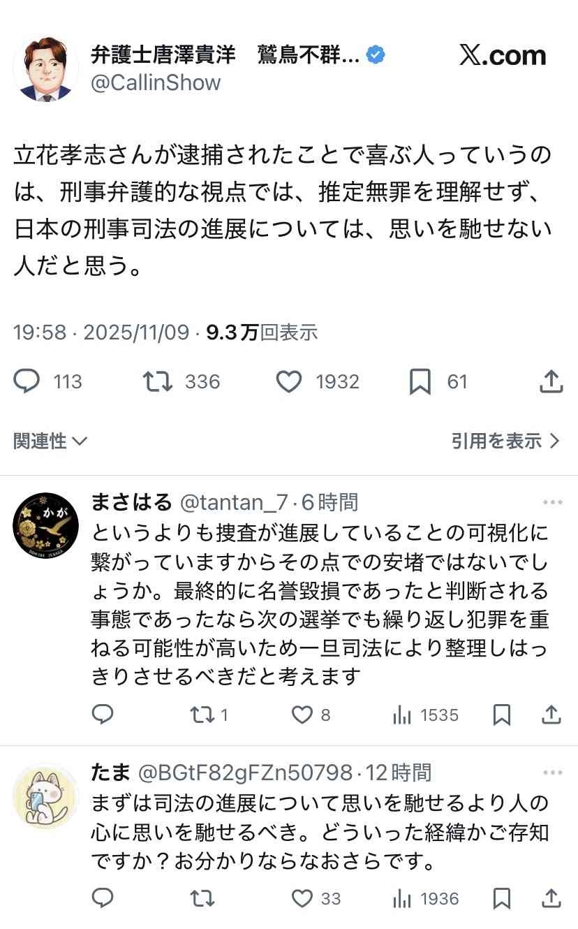 立花孝志さんが逮捕されたことで喜ぶ人っていうのは、刑事弁護的な視点では、推定無罪を理解せず、日本の刑事司法の進展については、思いを馳せない人だと思う。