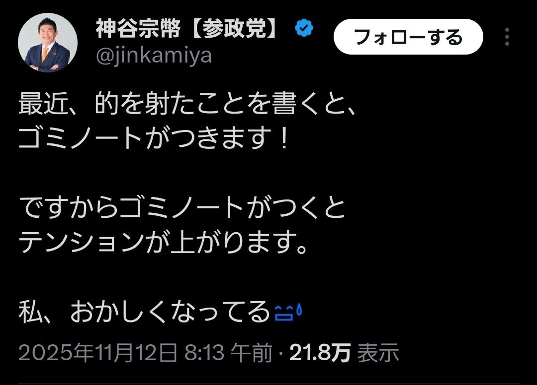 【高市悲報】参政党神谷「最近、的を射た事を書くとゴミノートがつく!テンション上がる!私、おかしくなってる🤩」