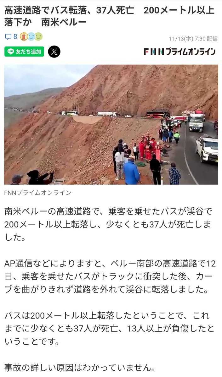 https://news.yahoo.co.jp/articles/12301cd69ebda27870c92a954f30ab4da53cd3d9リマAFP時事】ペルー南部で12日、2階建てバスがトラックと正面衝突した後、深さ200メートルの渓谷に転落し、少なくとも37人が死亡した。