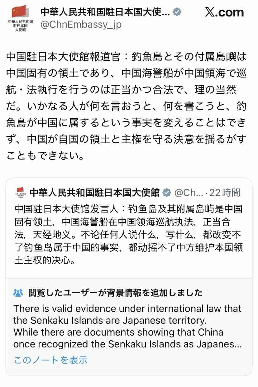 中国の駐日本大使館が21日夕、公式X(旧ツイッター)を更新。日中関係の緊張が高まる中、改めて尖閣諸島・魚釣島(中国では釣魚島と表記)について「中国固有の領土」と強く主張した。