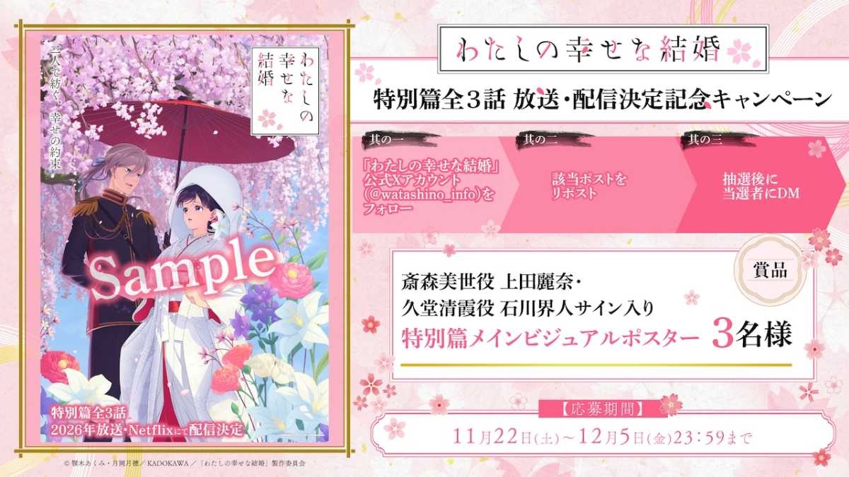 さらに「わたしの幸せな結婚」公式Xでは、本日11月22日の“いい夫婦の日”に合わせたプレゼントキャンペーンを展開。上田、石川の直筆サイン入りのキービジュアルポスターを抽選で3人に贈る。応募期間は本日から12月5日までだ。