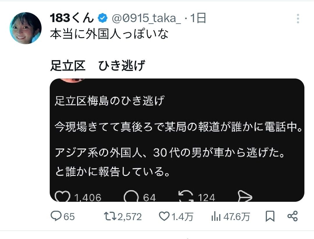 なんの情報もないのに外国人とか言い出す頭おかしい奴ふえすぎてこわい