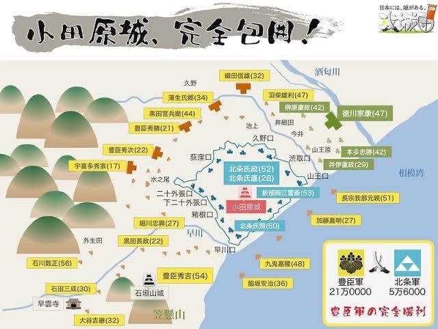ちなみに北条側は小田原評定で無策だったわけではなく国境の韮山、山中、足柄に数千の精鋭を籠もらせ攻略に手間取るところ野戦軍を出動させ各個撃破を狙っていた。