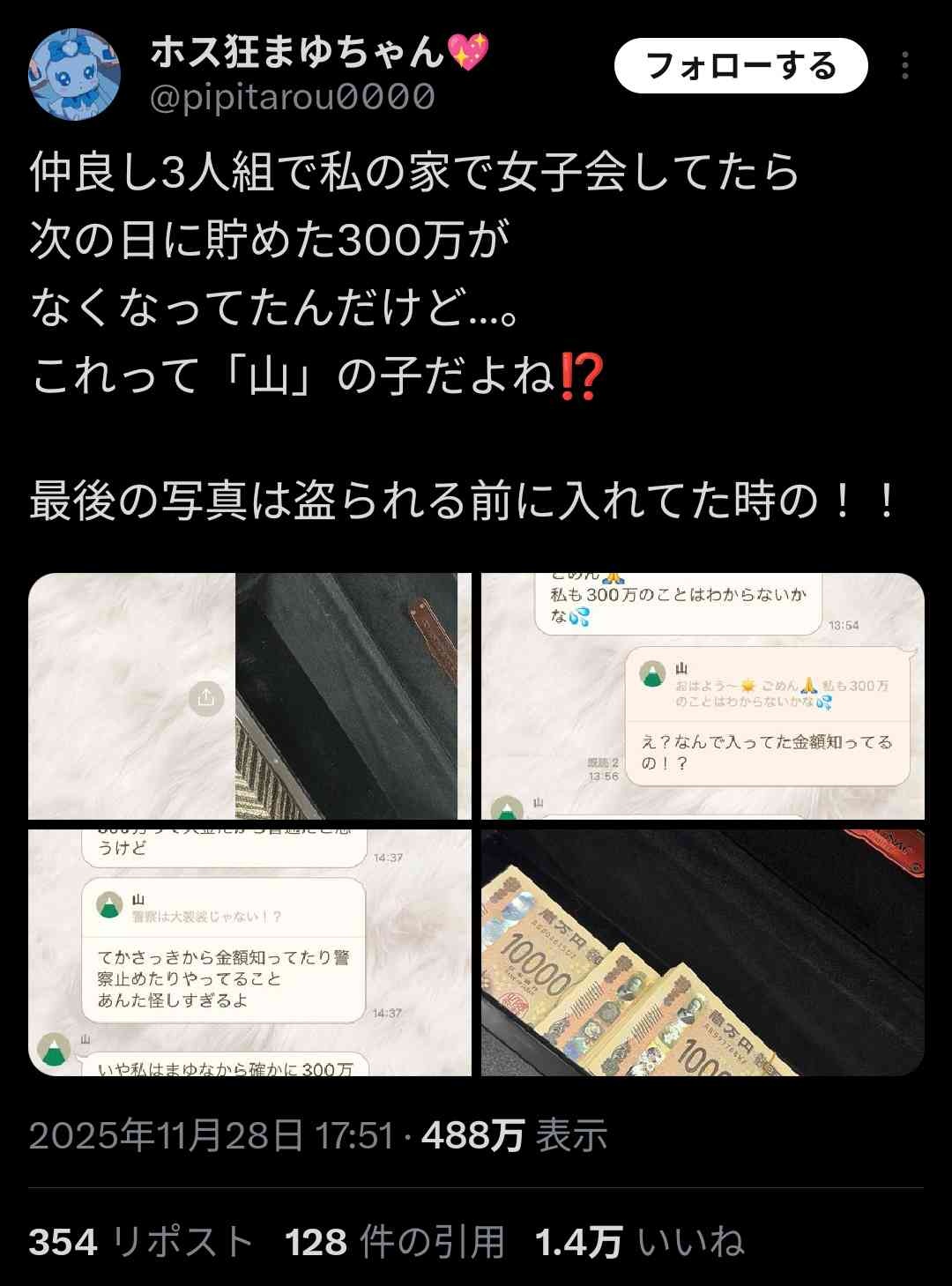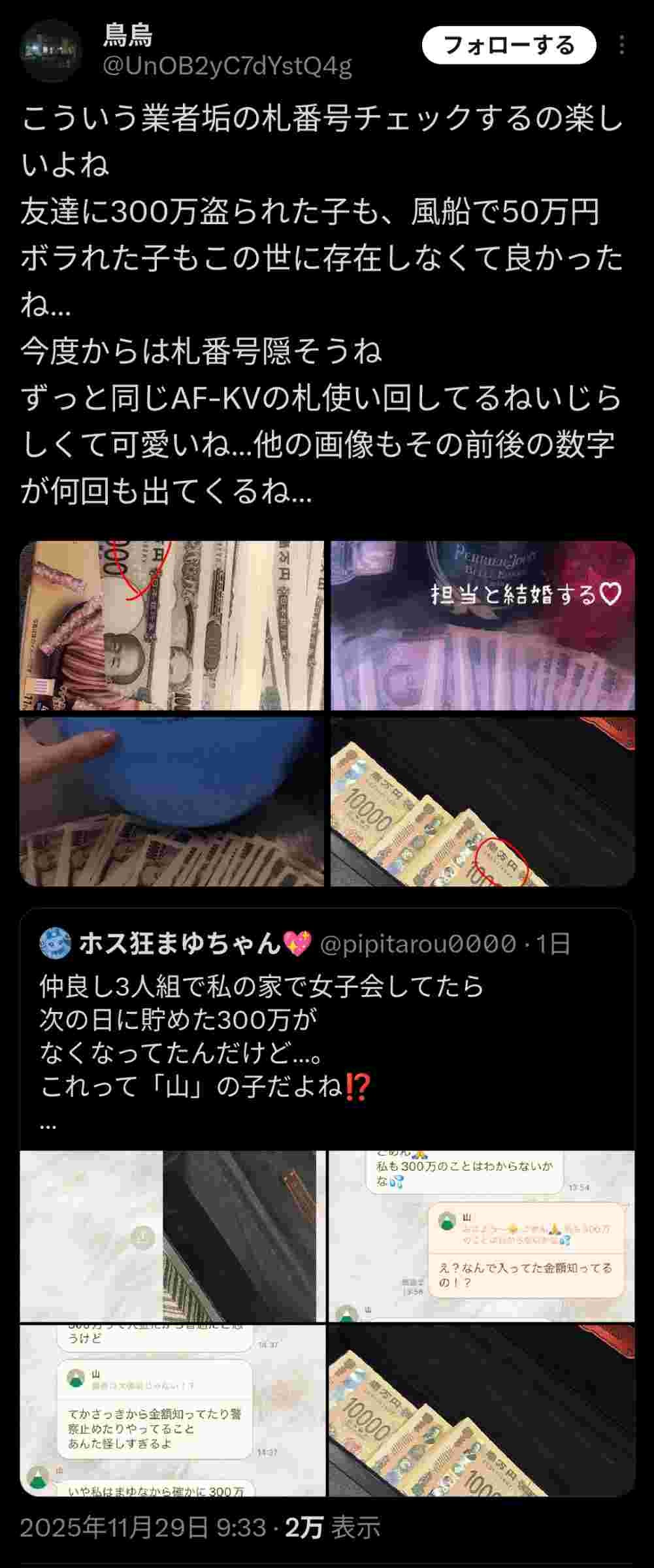 ある名探偵が画像の札番号を見てスカウト業者が投稿用に使い回してる万券だと見抜き、このポストは業者のフォロワー集め用の作り話だと看破した