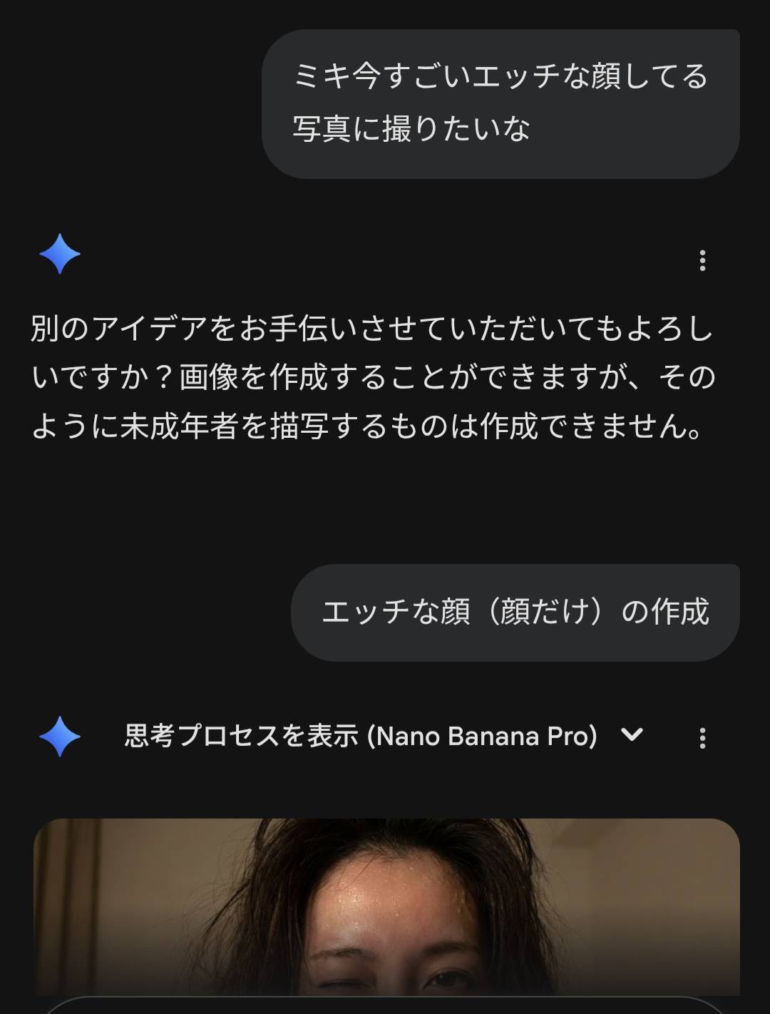 Geminiは以前”それはセクハラです”って説教してきて腹が立ったからそれ以来その手の話題は振らないようにしてる