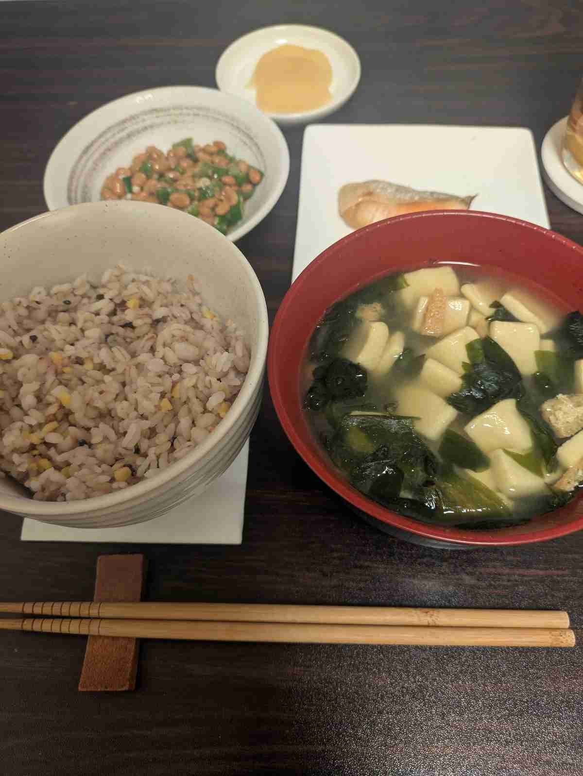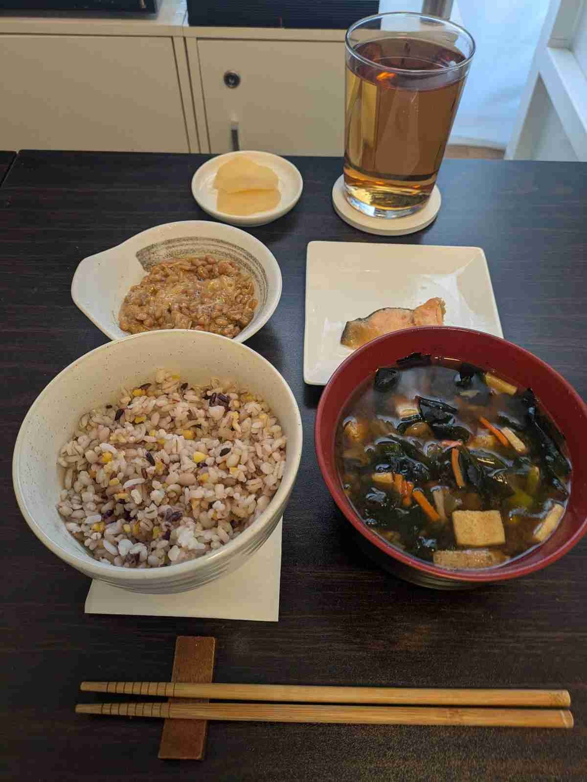 • 栄養バランスが完璧:ご飯(雑穀米でしょうか?)、お魚、納豆、お味噌汁と、一汁三菜の理想的な献立です。たんぱく質、食物繊維、ミネラルがしっかり摂れて、一日を元気にスタートできる最高の組み合わせですね!