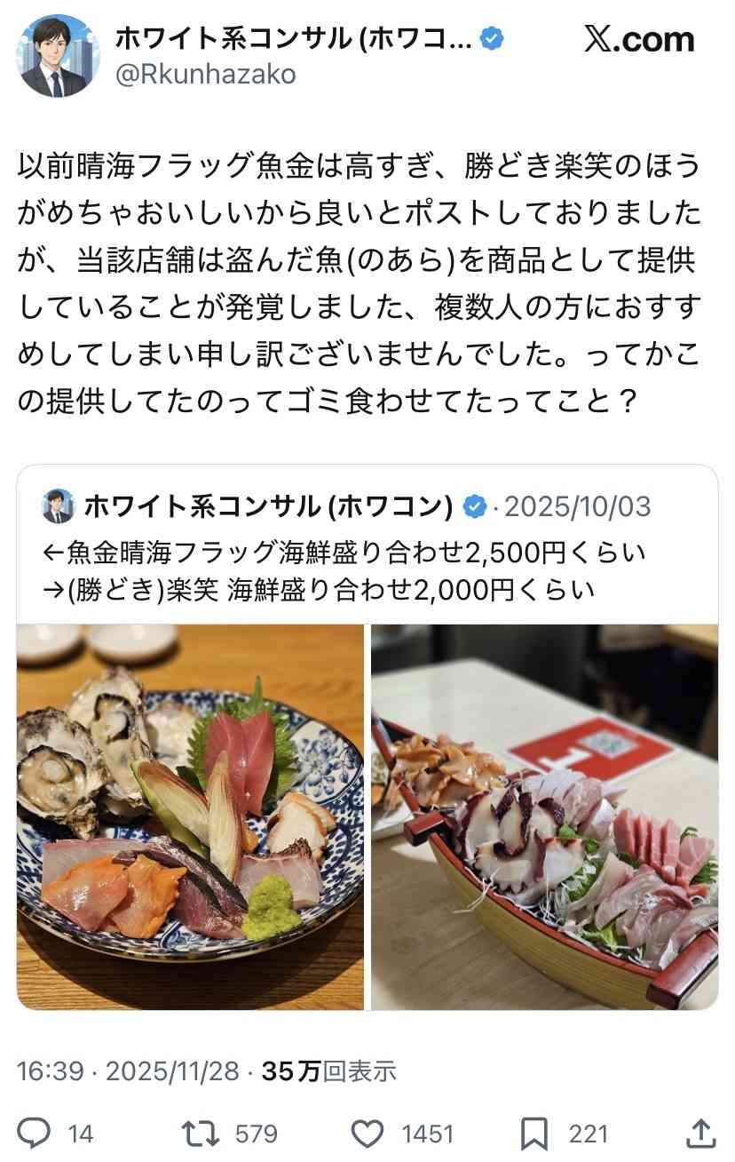 タワマン民「ここのお店安くて美味い」店主「魚の残骸で作ったからな」→店主逮捕