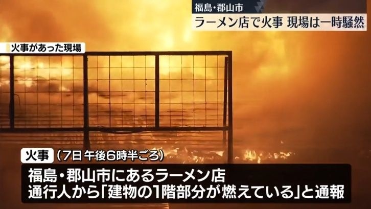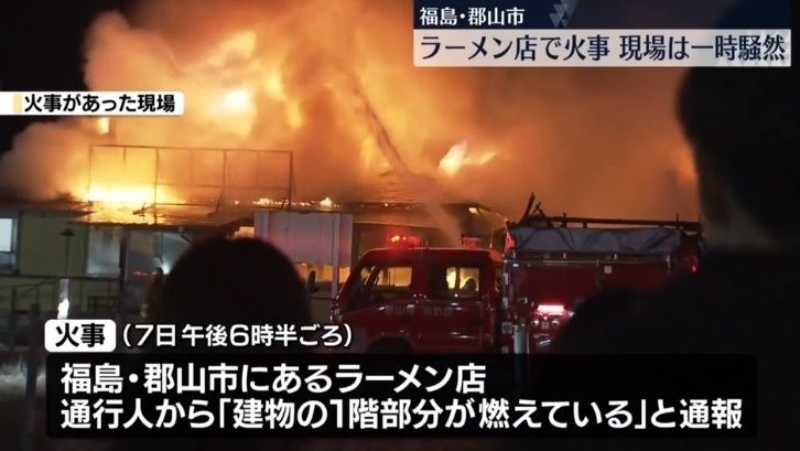 火事があったのは、福島県郡山市にあるラーメン店です。消防によりますと、7日午後6時半ごろ、通行人から「建物の1階部分が燃えている」と通報がありました。火の勢いはおよそ1時間半後に収まりましたが、建物の焼損は激しいということです。