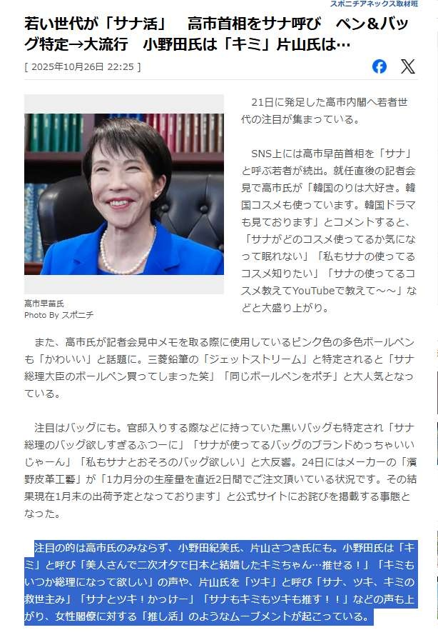 SNS上には高市早苗首相を「サナ」 と呼ぶ若者が続出。就任直後の記者会見で高市氏が「韓国のりは大好き。韓国コスメも使っています。韓国ドラマも見ております」とコメントすると、 「サナがどのコスメ使ってるか気になって眠れない」 「私もサナの使ってるコスメ知りたい」 「サナの使ってるコスメ教えてYouTubeで教えて~~」などと大盛り上がり。