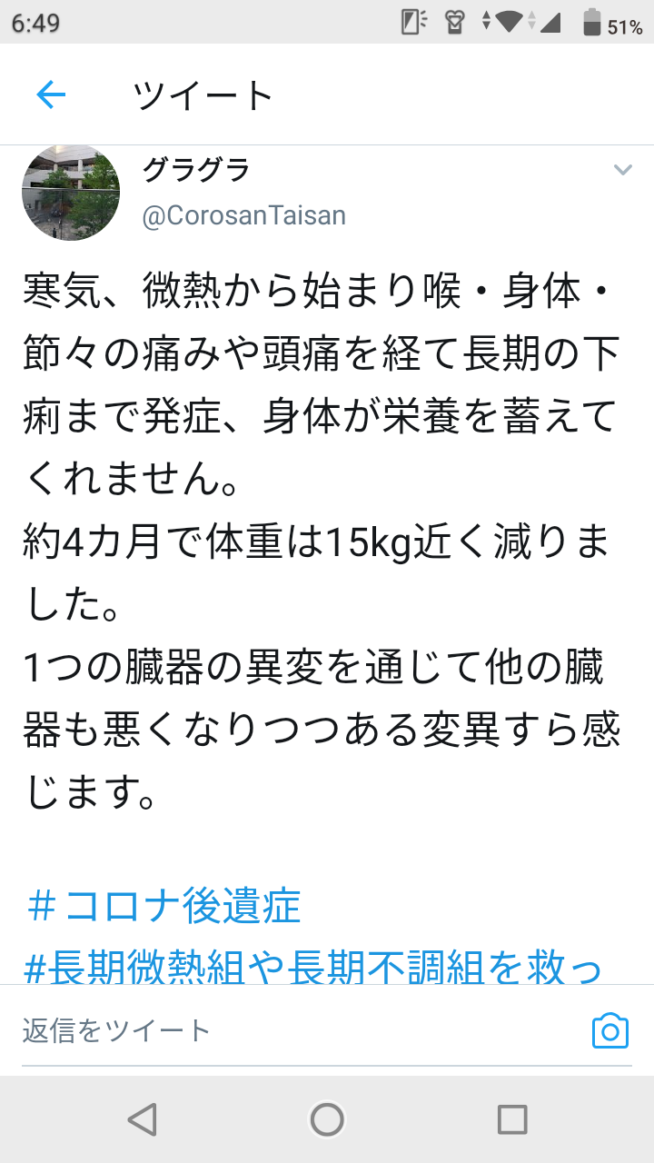 - コロナは間質系の肺炎で血管内炎症を起こすってのが特徴だから一度発祥したら肺機能が低下するのは当然だし炎症で臓器に影響が出るのも陶然