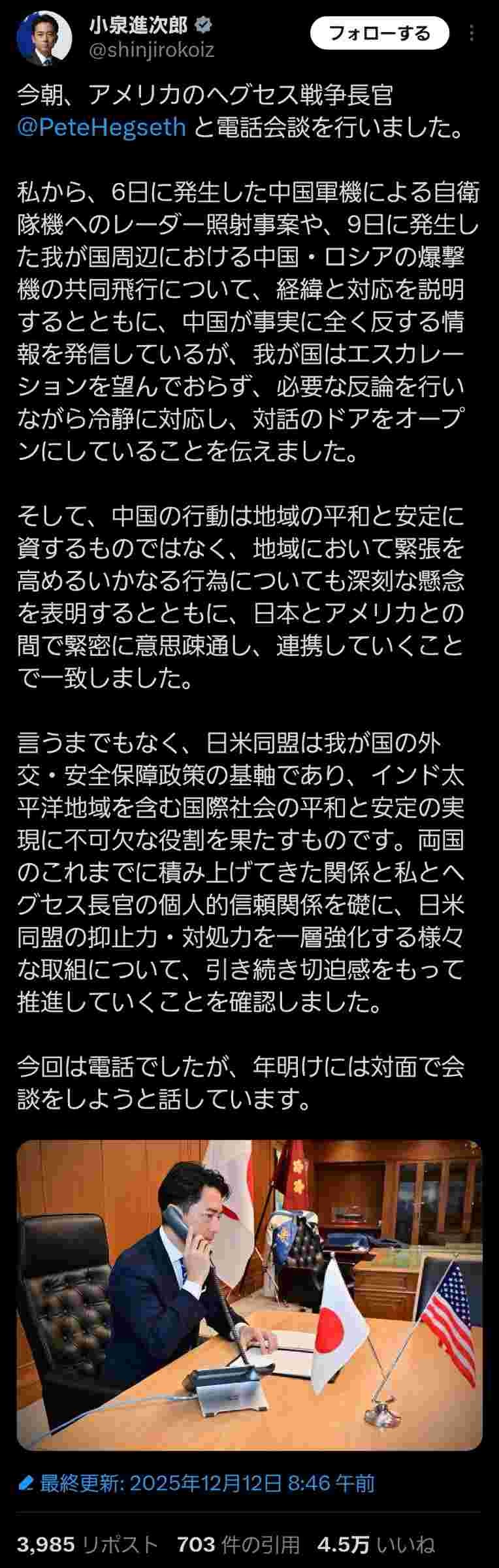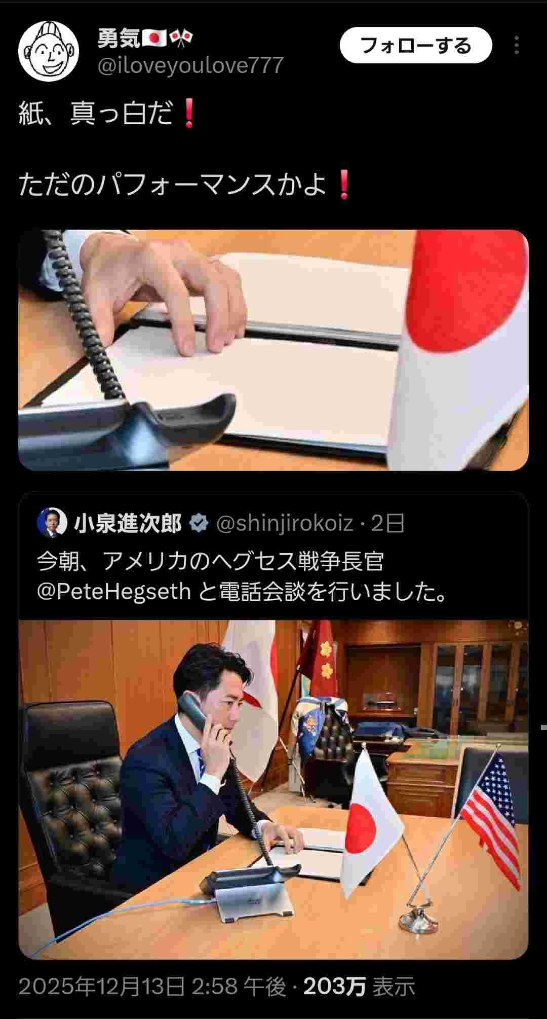 小泉の進さん「日米電話会談を行いました😤(パシャリ)」あからさまなパフォーマンスだと話題に